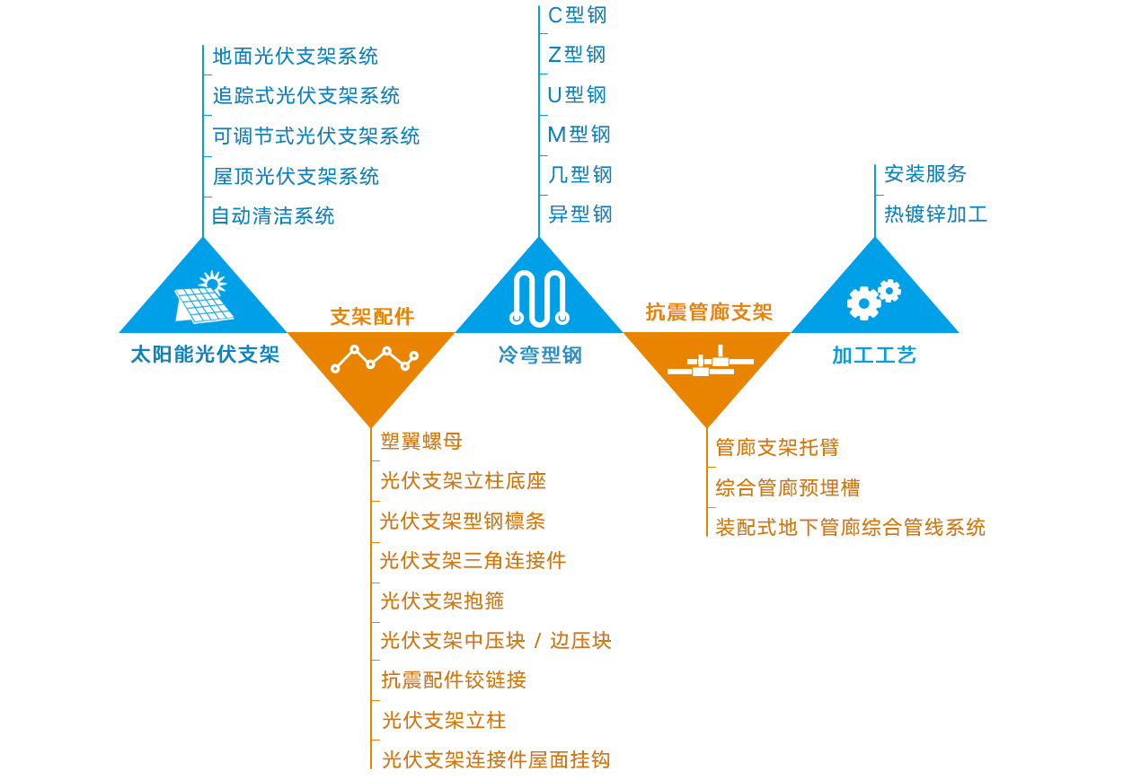公司始終專注于生產太陽能光伏支架及支架配件(地面支架系統、屋頂支架系統、可調節式支架系統、追蹤式支架、自動清潔系統等),C、Z、U、M、幾、異型、等冷彎型鋼,管廊抗震支架、代理熱鍍鋅加工、安裝等服務。