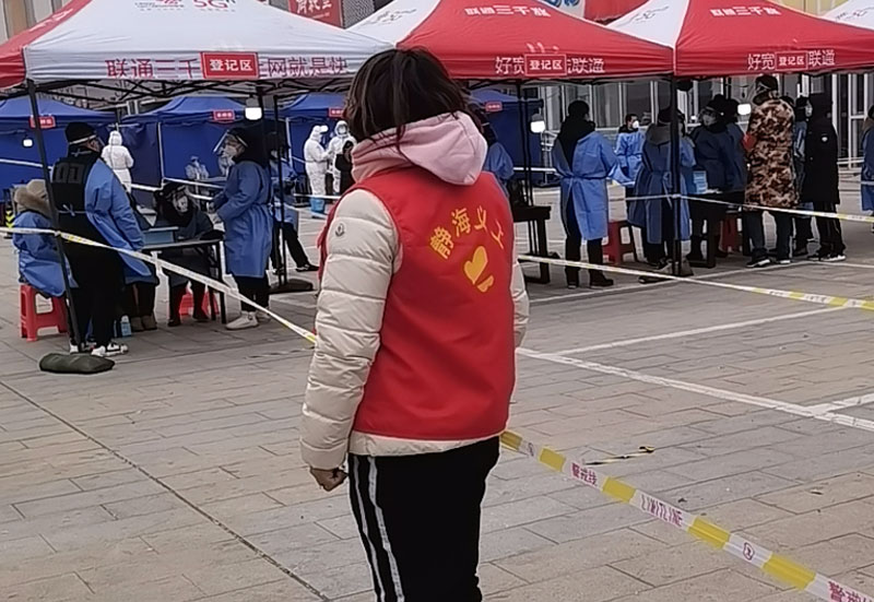 在各個核酸檢測工作點,除了專業又敬業的醫務人員外,還有一些這樣可愛的人,她們做好現場秩序的維護工作,使得核酸檢測工作有序開展。