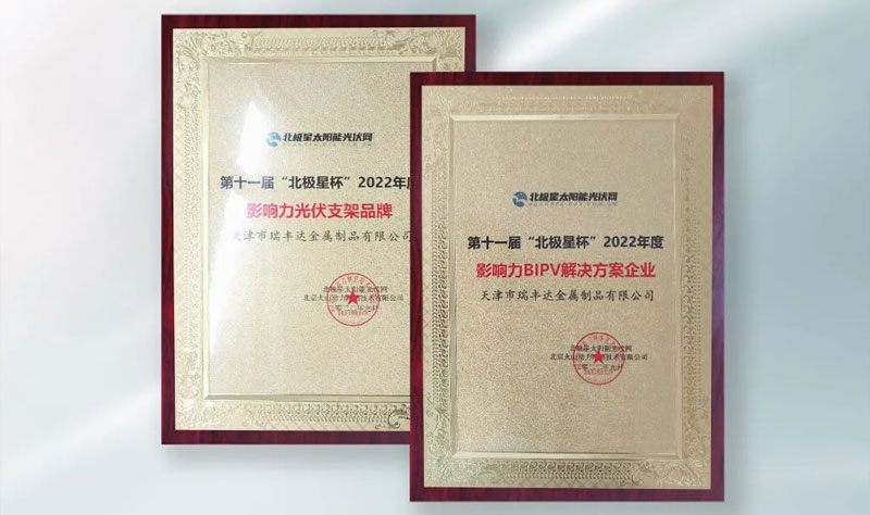 天津市瑞豐達金屬制品有限公司如約參加本次慶典,公司憑借優秀的產品質量以及一流的服務品質榮獲“北極星杯”2022年度影響力光伏支架品牌和“北極星杯”2022年度影響力BIPV解決方案企業兩項大獎。本次獎項獲得,表明了瑞豐達擁有過硬的產品質量以及良好的業界口碑,同時也肯定了瑞豐達作為一家新能源企業,“始終致力于發展光伏發電新能源領域,為發展綠色社會做出貢獻”的企業愿景。