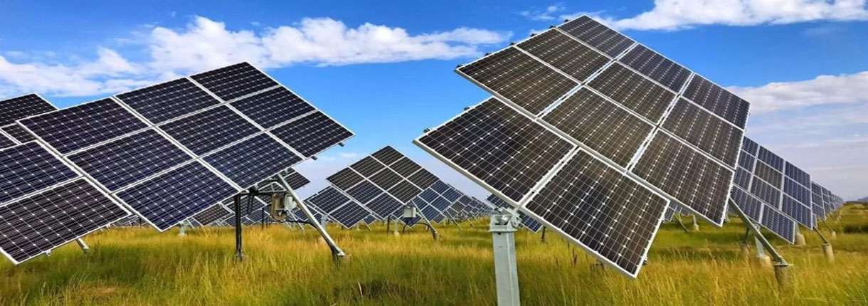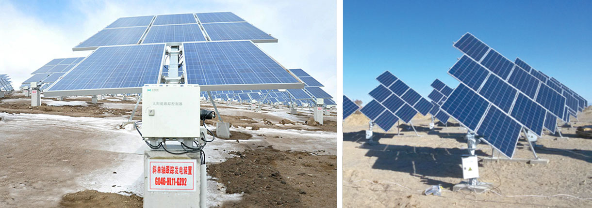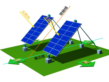 圖中是兩組平單軸跟蹤陣列示意圖,每塊電池陣列有自己的轉軸,轉軸線在與地面垂直的平面上,與地面有一個夾角,轉軸線與地軸線基本平行(春分或秋分時的地軸線)。轉軸安裝在支架上,電池陣列可繞自己的轉軸旋轉,圖中黃色箭頭線表示太陽光的方向。旋轉由太陽跟蹤控制裝置控制,使電池板轉軸垂直面與太陽光平行.